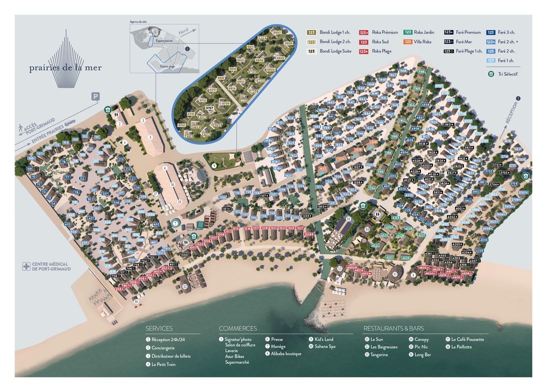 See Prairies de la Mer and its various services at a glance, thanks to the general map. You can download it in high definition by clicking on the button below.