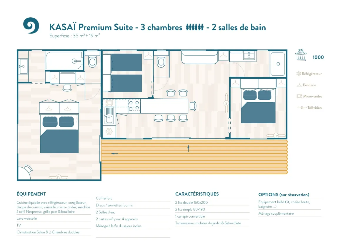 Ideal for up to 6 people, the Kasaï Premium Suite boasts generous spaces and a subtly refined atmosphere. The second en-suite bedroom offers a private and elegant space with its own bathroom and separate WC, as well as a dressing table and dressing room—absolute comfort to prolong the pleasure of your holiday.